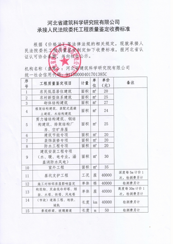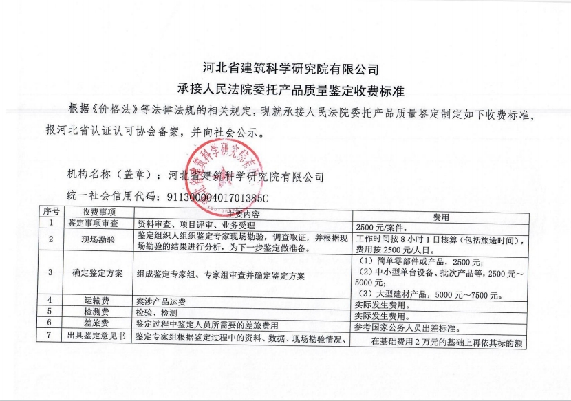 根據(jù)《河北省認(rèn)證認(rèn)可協(xié)會(huì)產(chǎn)品質(zhì)量鑒定管理辦法(試行)》第36條、《河北省認(rèn)證認(rèn)可協(xié)會(huì)工程質(zhì)量鑒定管理辦法(試行)》第35條“目前國(guó)家物價(jià)管理部門未對(duì)工程質(zhì)量鑒定收費(fèi)進(jìn)行統(tǒng)一定價(jià),鑒定機(jī)構(gòu)應(yīng)當(dāng)公示本機(jī)構(gòu)收費(fèi)標(biāo)準(zhǔn)”之規(guī)定,我公司參照財(cái)政部財(cái)科教【2017】128號(hào)《中央財(cái)政科研項(xiàng)目專家咨詢費(fèi)管理辦法》中的有關(guān)規(guī)定,并結(jié)合我公司產(chǎn)品質(zhì)量鑒定和工程質(zhì)量鑒定中鑒定專家工作的實(shí)際情況,制定了《河北省建筑科學(xué)研究院有限公司產(chǎn)品質(zhì)量鑒定/工程質(zhì)量鑒定收費(fèi)標(biāo)準(zhǔn)》(見(jiàn)附件)?,F(xiàn)予以公示。