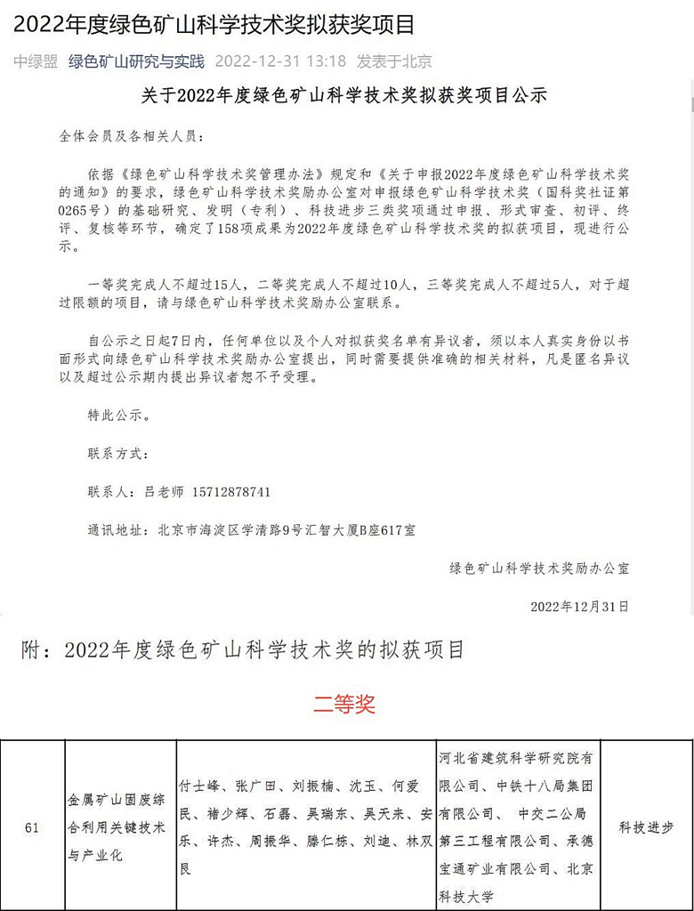 我公司申報的“金屬礦山固廢綜合利用關(guān)鍵技術(shù)與產(chǎn)業(yè)化”項目依據(jù)《綠色礦山科學(xué)技術(shù)獎管理辦法》規(guī)定和《關(guān)于申報2022年度綠色礦山科學(xué)技術(shù)獎的通知》的要求,經(jīng)綠色礦山科學(xué)技術(shù)獎勵辦公室對申報綠色礦山科學(xué)技術(shù)獎(國科獎社證第0265號)的基礎(chǔ)研究、發(fā)明(專利)、科技進步三類獎項通過申報、形式審查、初評、終評、復(fù)核等環(huán)節(jié),確定我公司申報的“金屬礦山固廢綜合利用關(guān)鍵技術(shù)與產(chǎn)業(yè)化”榮獲2022年度綠色礦山科學(xué)技術(shù)獎二等獎。